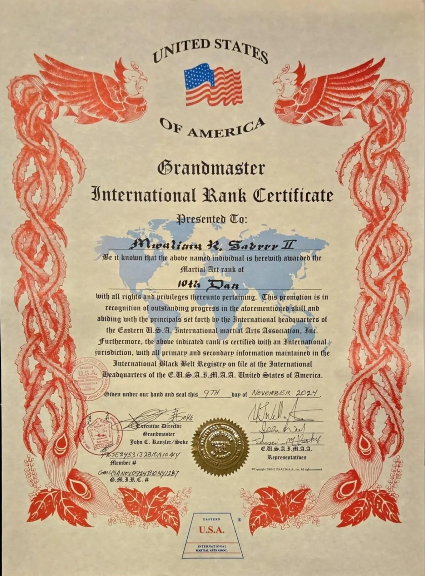 Born August 22 New Rochelle, NY. Martial Arts training started with Father, Mother, and both Godfathers training him in Boxing, Kickboxing Goju, Kyokushin Karate, Tai Chi, Yoga, Tae Kwon Do and Sanuces Ryu Jiu Jitsu (influenced by Japanese Jiu Jitsu) and received first Black Belt at 6 years old. As a teenager he trained in Kumite Ryu Arnis Jitsu receiving Black Belt in 2008 and winning numerous Martial Arts Tournaments from local to international invitations including full contact and bare knuckle continuous fighting/Kickboxing tournaments. He later began training in Isshinryu receiving a Black Belt in 2014 in Isshinryu Karate. GrandMaster Sabree later trained in BJJ competing in no gi category winning 1st place at NAGA. He’s also trained in Muay Thai and Krav Maga earning Instructor Level Ranks. His most recent accomplishment is fighting for Team America in the London International Martial Arts Invitational 2025 title BCKA (British Chinese Kickboxing Association) Winning Grand Champion in the Heavyweight Kickboxing Division.